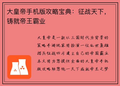 梦三国如何快速通关挑战吕布 一、选择合适的武将 在梦三国中,选择合适的武将是通关挑战吕布的关键。首先要考虑武将的属性和技能,尽量选择攻击力和防御力较高的武将。要根据自己的战术风格选择武将,比如喜欢近战的可以选择吕布、关羽等,而喜欢远程攻击的可以选择黄忠、张飞等。还要考虑武将之间的配合,选择能够互相增强的武将组合,提高整体实力。 1.1 武将属性的分析 在选择武将时,要仔细分析武将的属性。攻击力决定...